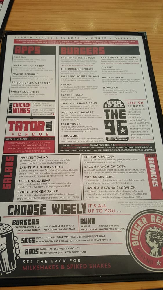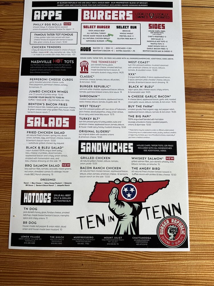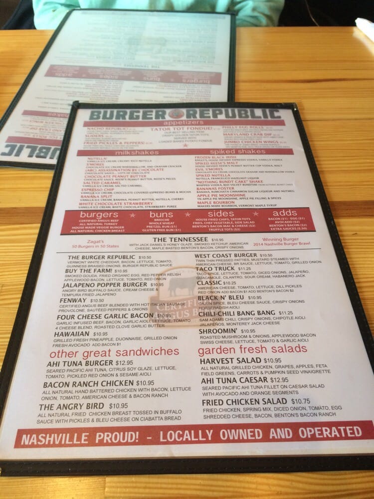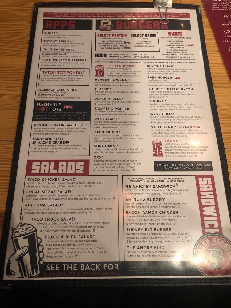 Introducing the menu at Burger Republic, a burger joint located at 6900 Lenox Village Dr in Nashville. Known for their gourmet burgers and tasty milkshakes, this spot offers a variety of options for both meat lovers and vegetarians. With a full bar, happy hour specials, and free Wi-Fi, Burger Republic is perfect for lunch, dinner, or gatherings with friends and family. Customers rave about the friendly service, fast delivery, and the strong drinks. Don't miss out on their signature West Coast burger and flavorful truffle tots. Whether you're a local or a tourist, Burger Republic promises a satisfying dining experience.